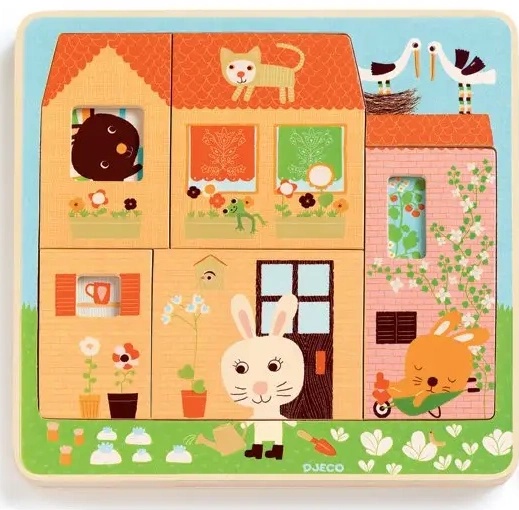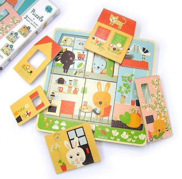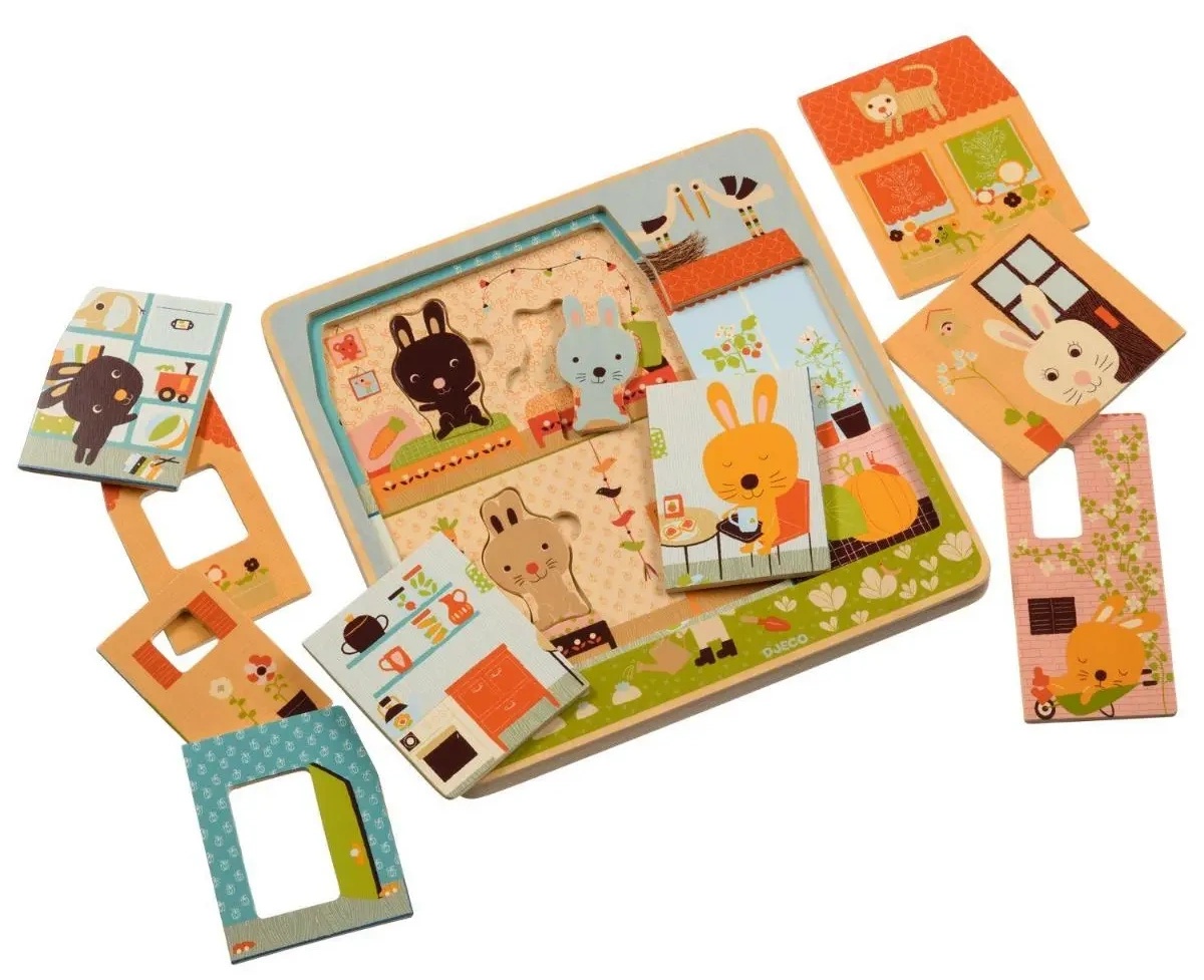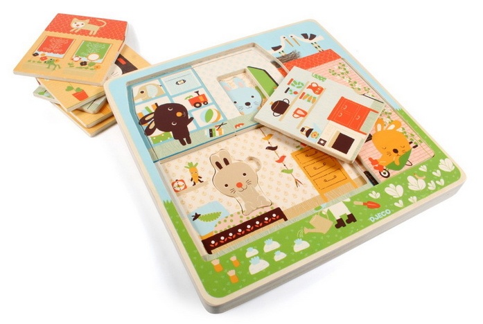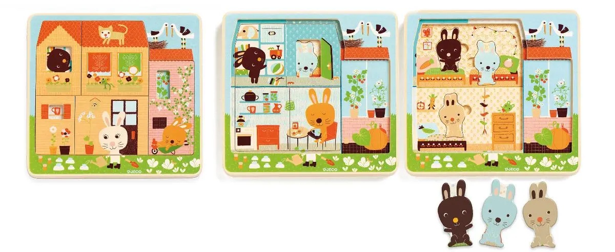 Трехслойный пазл "Дом зайцев" от компании Djeco непременно привлечет внимание детей своим необычным исполнением и красочным внешним видом. Данное изделие состоит из трех деревянных основ с углублениями, которые детям необходимо будет заполнить подходящими элементами. Уникальный пазл позволит юным любителям головоломок собрать три различные картинки с изображением забавных зайчиков и их уютного домика. Все элементы данного набора изготовлены из высококачественной шлифованной древесины.