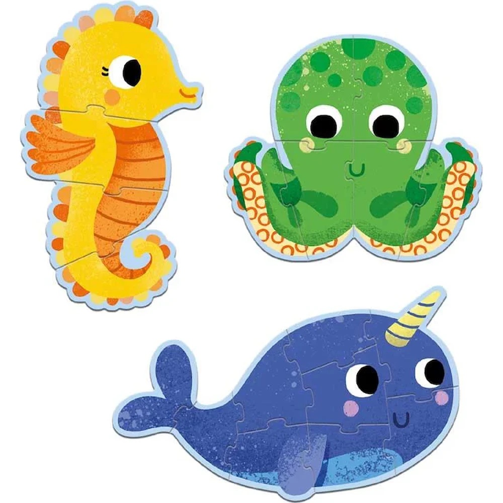В набор входят 3 пошаговых пазла с яркими морскими животными: