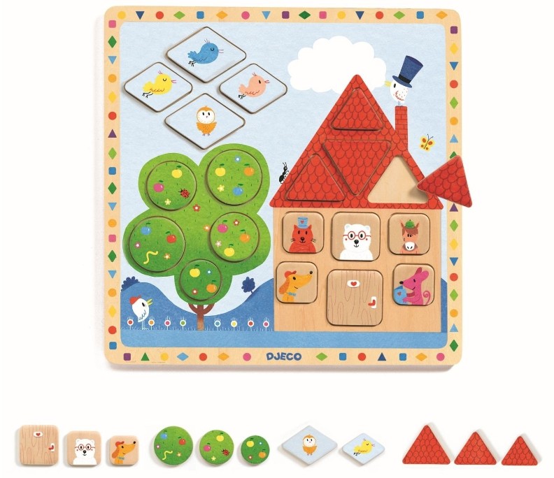 Развивающая моторная игра разнообразит досуг малышей в возрасте от 3 лет и поможет приобрести им полезные навыки и знания. Игровые атрибуты представлены прямоугольной рамкой со скругленными углами с изображением домика, деревца и птичек на голубом небе и вкладышами разных геометрических форм. Каждому вкладышу на основании предназначено собственное место, задача ребенка – собрать рамку, вставив все вкладыши на место. В процессе игры ребенок потренирует память, внимательность, зрительное и цветовое восприятие, моторику, логическое мышление, усидчивость, научится различать предметы по форме. Игровые элементы имеют привлекательный дизайн, придуманный французскими художниками, выполнены из дерева с приятной текстурой, поверхность хорошо ошлифована, окрашена нетоксичными красками.