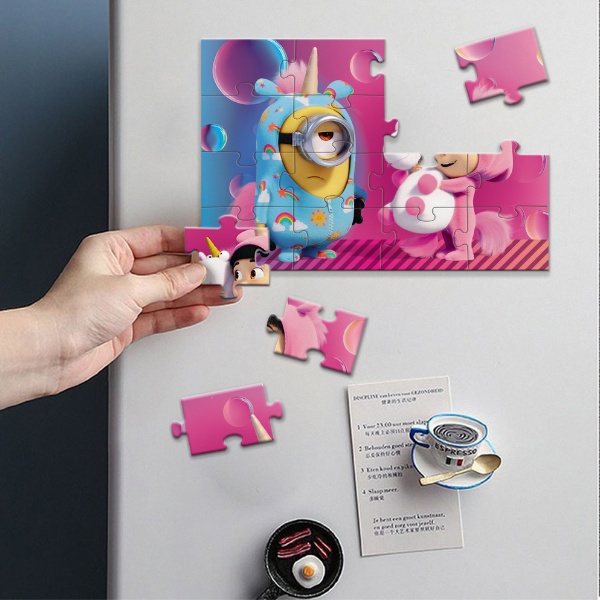 Пазл выполнен в виде магнитов, поэтому он отлично подойдёт для размещения на холодильнике или другой металлической поверхности. Костюмы единорогов на персонажах добавляют веселья и ярких эмоций.