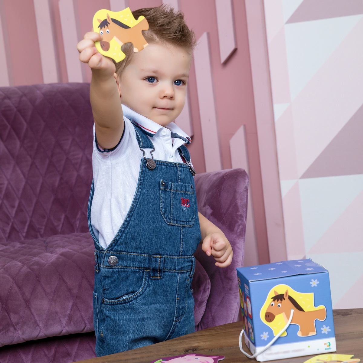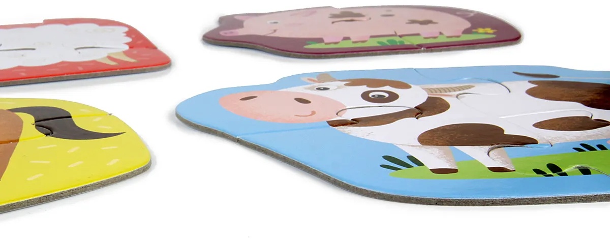Пазлы — очень увлекательная игра. Для самых маленьких детей они содержат небольшое количество элементов, а собранные из них цветные картинки знакомы и понятны малышам.Пазл 2-3-4 элемента «Домашние животные» представляет собой фигурные пазлы на которых изображены животные. Причем изображения поросёнка и курочки состоят из двух элементов, овечки и козочки из трех деталей, лошадка и корова - из четырех. Чтобы малышу было легче найти детали одной картинки, животные изображены на цветном фоне: лошадка на желтом, козочка на оранжевом, овечка на красном. Сначала ребенку можно предложить составить изображение, состоящее из двух деталей, а затем усложнить задание. В процессе таких упражнений у малыша будет развиваться образное и логическое мышление, восприятие отдельных и целых элементов, мелкая моторика рук.