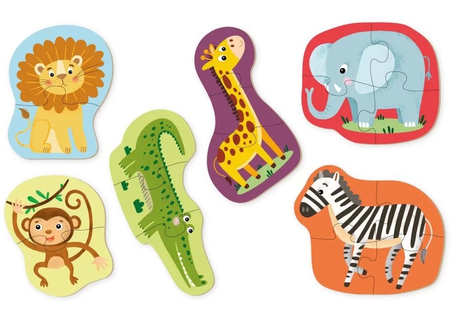 Пазл 2-3-4 элемента «Дикие животные» представляет собой фигурные пазлы с животными Африки.