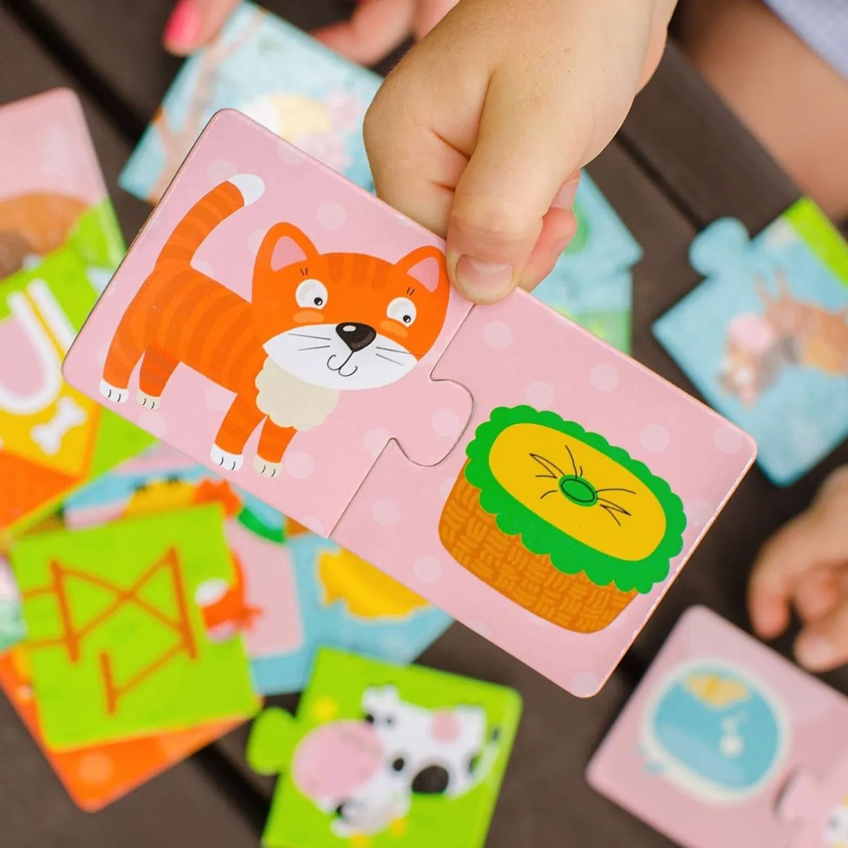 Пазлы серии "Парочки" были созданы специально для малышей. По названию настольной игры можно догадаться, что картинки состоят всего из двух частей. Яркие и разноцветные элементы обязательно привлекут детское внимание. В собранном виде они представляют собой изображения диких и домашних животных. Возле каждого животного, можно увидеть его любимое лакомство. Малыш с большим интересом будет изучать, что любит каждое животное. Кошка обожает молочко, пингвину по нраву рыба, собачка в восторге от вкусной косточки. Ребенку следует сложить картинки в соответствии с вкусовыми предпочтениями каждого животного. Всего в наборе имеется 24 части, из которых требуется собрать 12 иллюстраций. На первый взгляд простая игра, на самом деле является сложной задачей для ребенка. Ведь ему требуется взять пазл с изображением животного, затем подумать над тем, чем оно питается, найти лакомство и сложить две части воедино. При этом малышу необходимо быть предельно внимательным, чтобы накормить каждое животное соответствующим кормом. В процессе игры малыш знакомится с разными видами животных, запоминает их внешние особенности, узнает, чем они питаются. В процессе работы с пазлами у ребенка развивается зрительное восприятие, логическое мышление, ассоциативные связи, память, внимание, мелкая моторика.