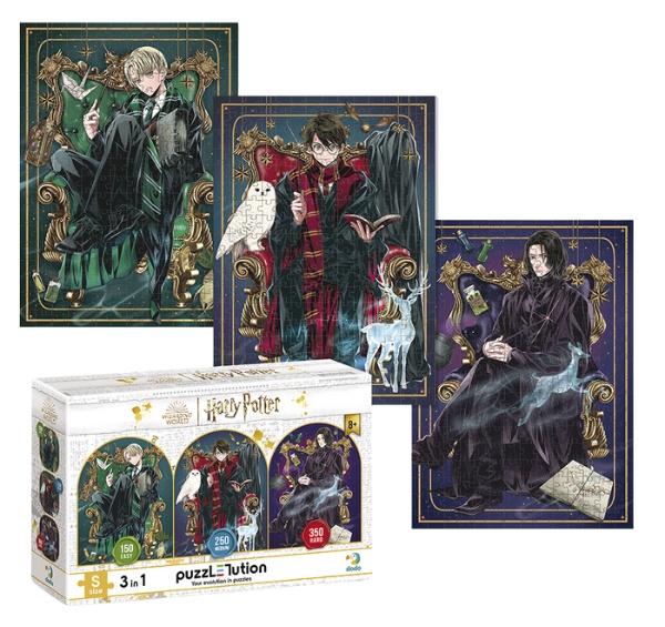 Пазлы «Harry Potter» 3 в 1 – это уникальный набор из трех пазлов разной сложности, созданный для поклонников волшебного мира. В комплект входят изображения любимых персонажей: Драко Малфоя (150 деталей – легкий уровень), Гарри Поттера (250 деталей – средний уровень) и Северуса Снейпа (350 деталей – сложный уровень).