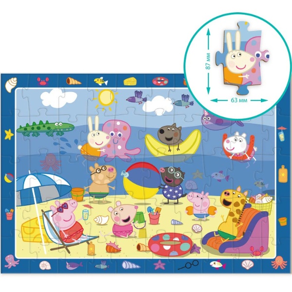 Пазл состоит из 50 элементов и разработан для развития внимания, воображения и моторики у маленьких детей. На изображении вы увидите Пеппу вместе с ее семьей и верными друзьями, которые весело проводят время на берегу моря, наслаждаясь яркими летними каникулами. Особенность этого пазла – наличие рамки с различными элементами, которые детям нужно будет найти после сборки пазла.