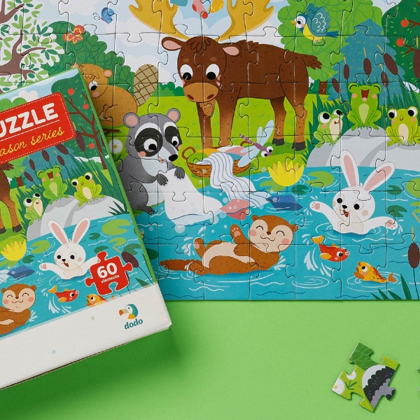 Представляем вашему вниманию увлекательный пазл “Солнечные дни” из серии “Времена года”. Настало время летних забав! Животные пришли купаться в озере и греть шерсть на солнышке. Но и о делах не стоит забывать, думает енотик, и начинает стирку.