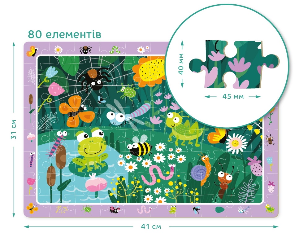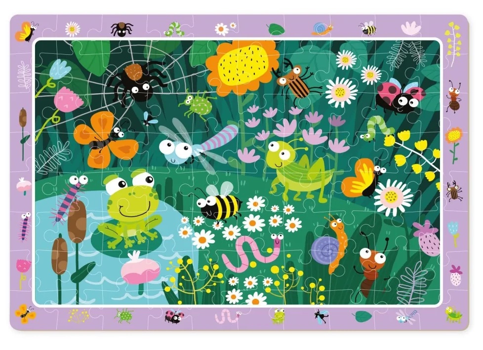 Что делают насекомые, прячась в глубине сада, где их не видно? Конечно, я устраиваю сумасшедшую вечеринку. Они украшают цветами все вокруг и собираются вокруг пруда. Вы видели всех насекомых? Особенностью пазла-наблюдения является цветная рамка, на которой изображены элементы пазла. Задача ребенка - найти изображения из рамки на большом пазле. Игра с таким пазлом учит детей обращать внимание на детали и скорость реакции.
