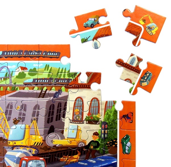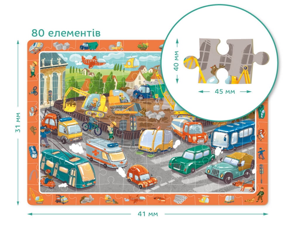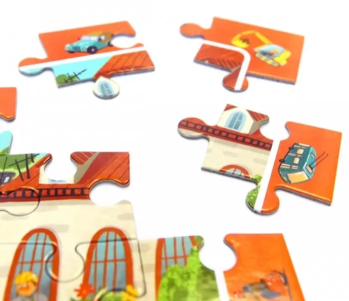 Для начала ребенку предлагается собрать иллюстрацию из 80 пазлов. По периметру основного пазла нарисованы элементы. Задача малыша найти их внутри пазлового поля.