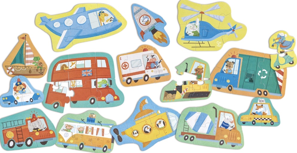 Этот набор из 15 классических пазлов познакомит малышей с различными видами транспорта: машины, вертолёты, самолёты, лодки и даже подводная лодка.