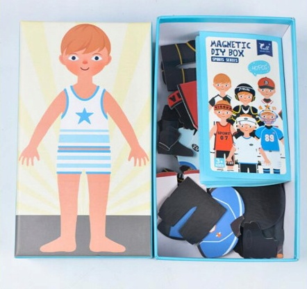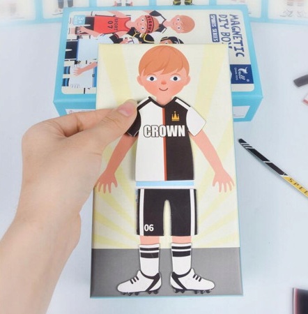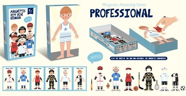 В набор входит 40 элементов среди которых картонная упаковка с магнитной доской, один персонаж, который необходимо одеть ответственно спортивной деятельности (футболиста, хоккеиста и т.д.). В коробке имеется несколько видов нарядов, также ребенок может комбинировать элементы нарядов из разных комплектов.
