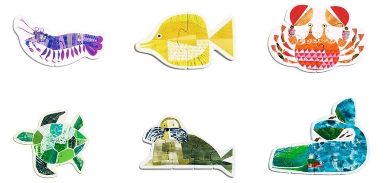 Пазлы варьируются от 2 до 6 частей, адаптированные для того, чтобы помочь маленьким детям сделать первые шаги в сборке пазлов.