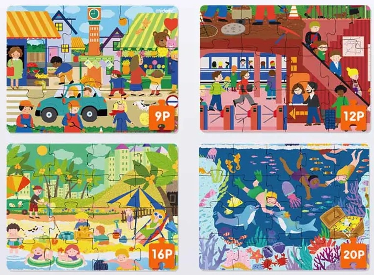 От 9 до 20 штук, от простых до сложных; иллюстрации ежедневных сцен в пазлах Mideer Level Up 4-в-1 увлекательны и изобретательны!