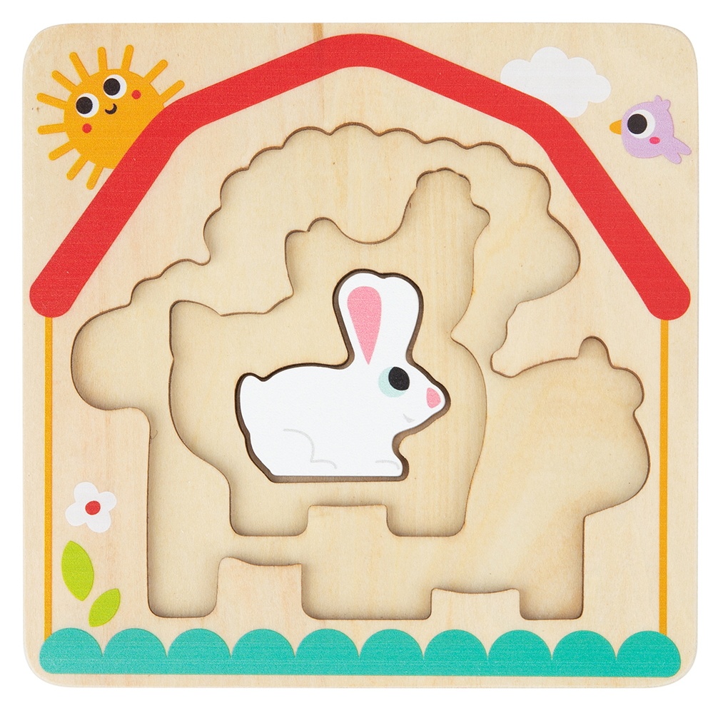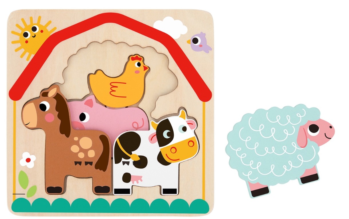 Деревянная многослойная головоломка «Ферма» от Tooky Toy — это головоломка из 7 частей со скрытыми деревянными элементами, изображающими сельскохозяйственных животных в 3 слоях.
