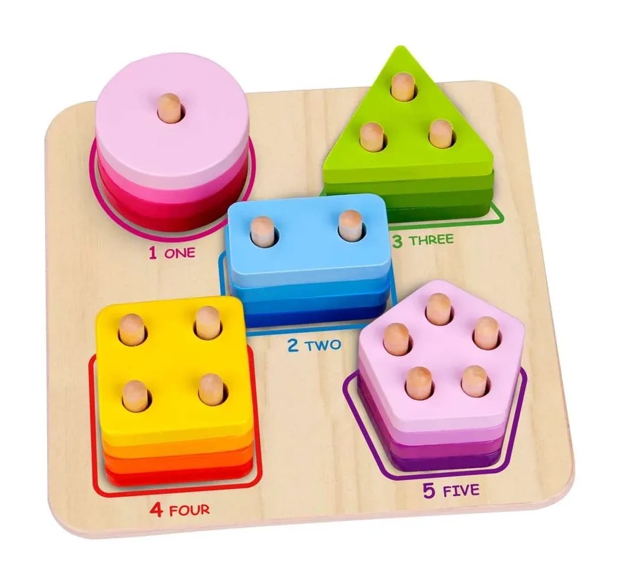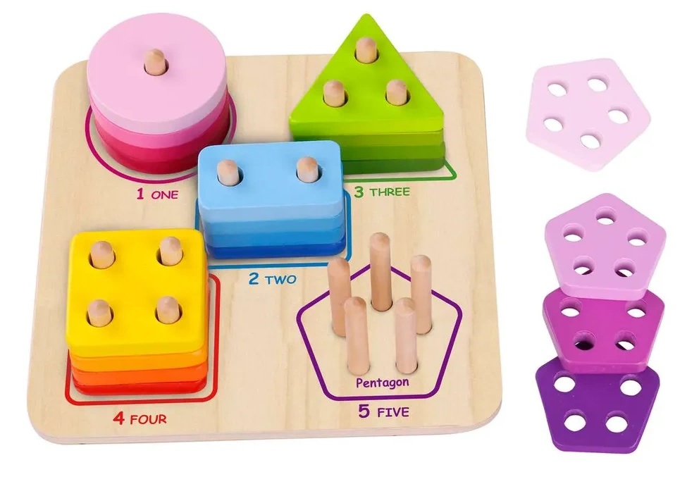 В основании сортировщика штырьки для нанизывания и построения 5 мини-пирамидок. Каждый штырь имеет свою рифленость, которая соответствует каждой фигурке. Предложите малышу соблюдать последовательность цветов. Так сложнее и интереснее.