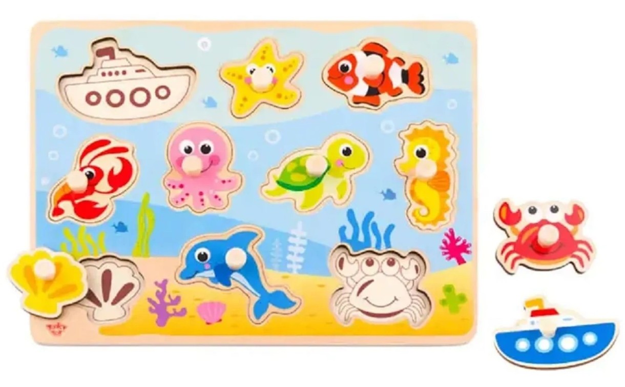 Деревянная рамка-вкладыш с 10 вкладышами. Игры с пазлами развивают мелкую моторику, пространственное восприятие, логику, навыки решения проблем и дают ощущение собственных успехов и достижений. Игра-головоломка - это прекрасный способ для детей развлечься, развивая физические когнитивные и эмоциональные навыки. Игрушка изготовлена из высококачественного дерева, покрыта нетоксичной краской на водной основе и совершенно безопасна для малышей. Отполированная древесина удобно ложится в детскую ручку и дарит эстетическое удовольствие от игры. У каждого вкладыша имеется круглая деревянная ручка. Для детей от 18 мес.