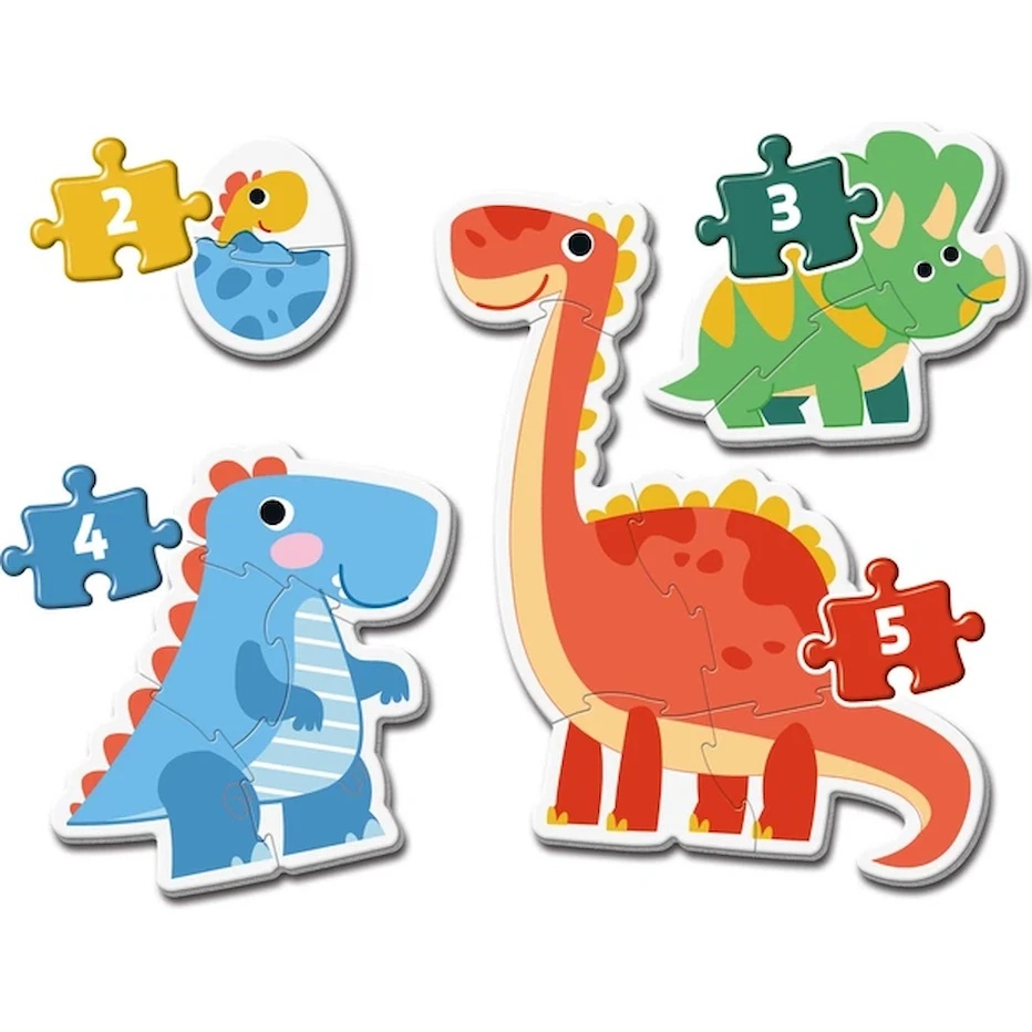 Набор включает 4 пазла разной сложности — на 3, 6, 9 и 12 элементов, что позволяет постепенно переходить от более простых изображений к более сложным. Такой формат отлично подходит для первых занятий с пазлами и помогает ребёнку учиться сопоставлять детали, цвета и формы.