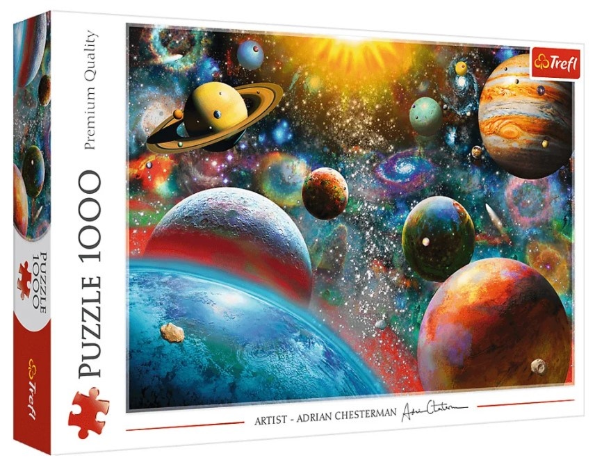 Пазлы на 1000 элементов с красочным изображением безграничного космического пространства с картины "Космос" известного британского цифрового художника и иллюстратора Адриана Честермана.