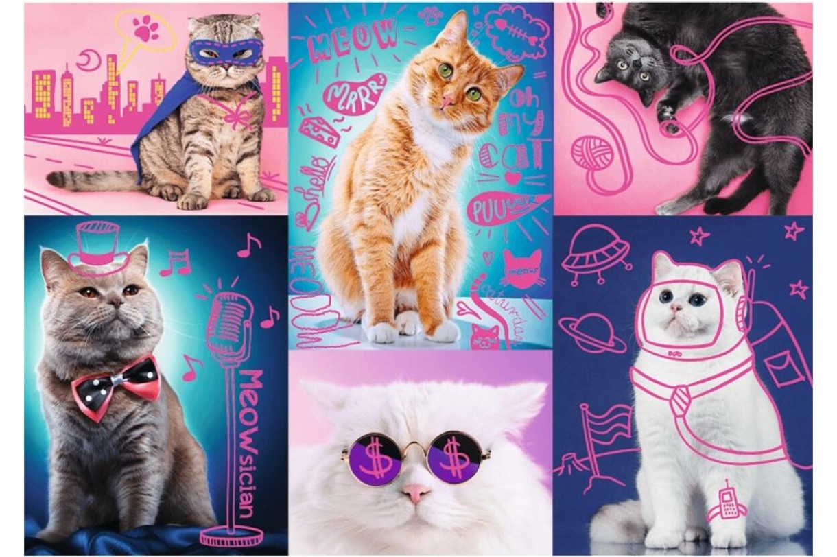 Пазлы на 1000 элементов из серии Neon Color Line - это коллекция головоломок, которая захватывает цветом и современным дизайном! «Супер - котики" - это пазлы с изображением в виде коллажа нескольких забавных котиков разнообразных пород, для изготовления которых производитель использовал специальные краски, чтобы получить интенсивный неоновый эффект. В сложенном виде размер картинки составляет 68х48 см. Высокое качество, насыщенность цветов и безопасность при сборке пазлов обеспечивает специальный каландрированный картон, который отражает свет и покрыт экологическими красками.