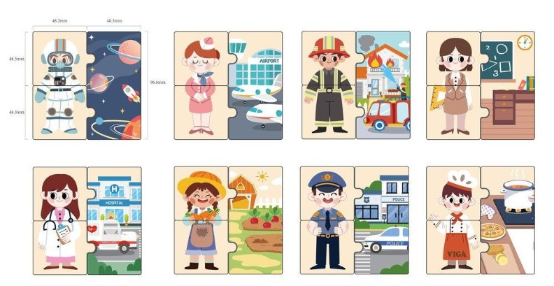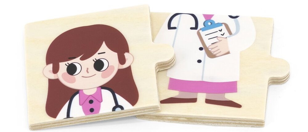 Деревянный пазл «Профессии» от VIGA Toys — отличный дидактический инструмент для ознакомления детей с разными профессиями, действиями, необходимыми аксессуарами для работы и местом ее занятий. Набор содержит изображения людей (которые находятся в 2-х отдельных частях) занимающихся разными профессиями, а также рабочие места, на которых они практикуются.