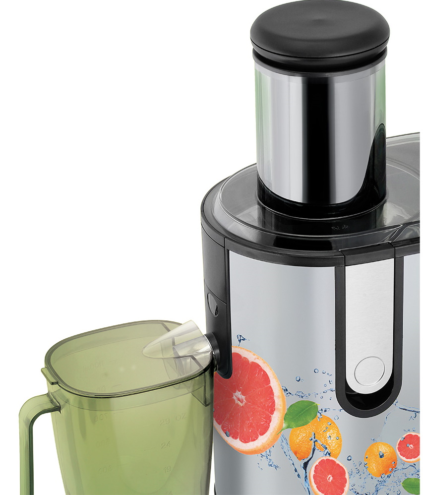Модель обеспечивает качественный отжим жмыха, который отводится в съемный резервуар. Сок поступает в отдельную емкость, рассчитанную на 1,1 л жидкости. В приборе предусмотрена противокапельная система для предотвращения попадания напитка на стол.