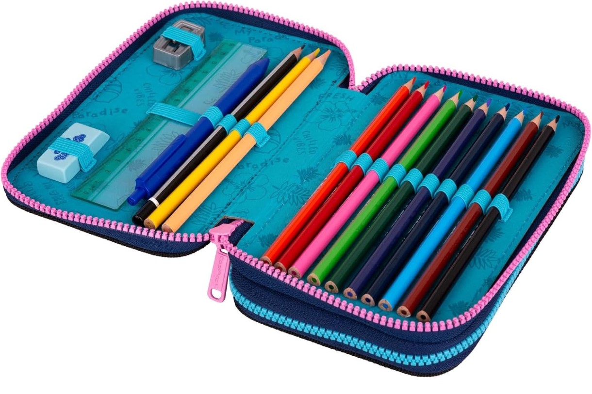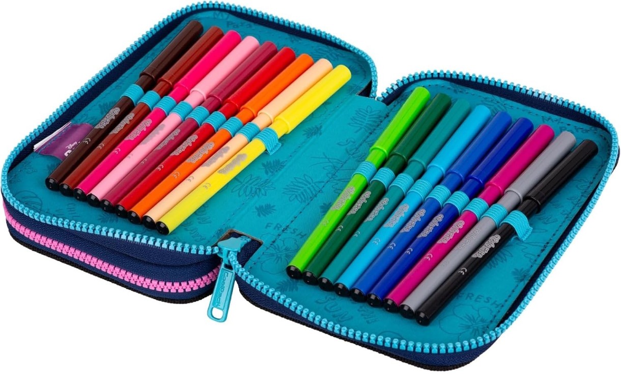 Наполнение пенала включает: 12 карандашей, карандаш, точилка, ластик, 18 маркеров, линейка и ручка.