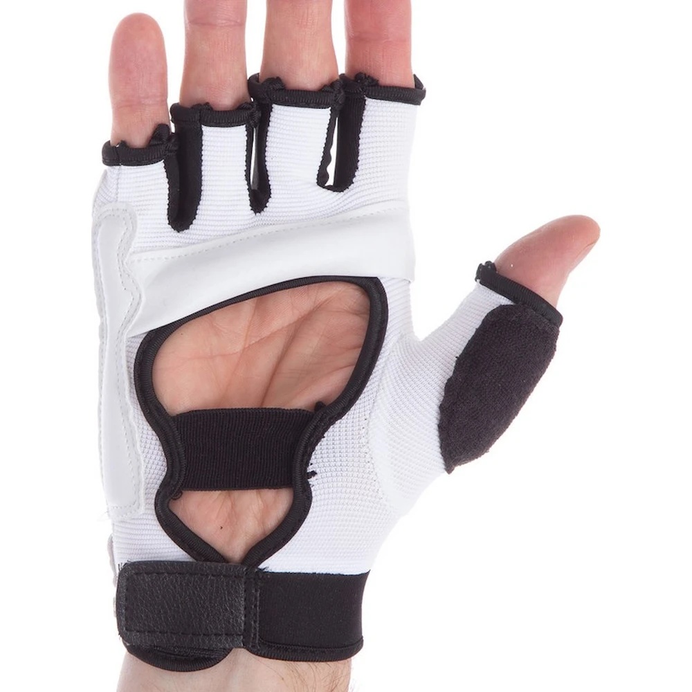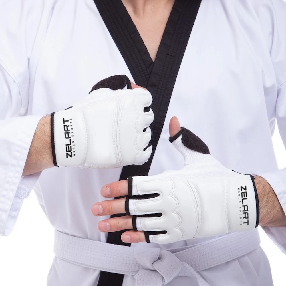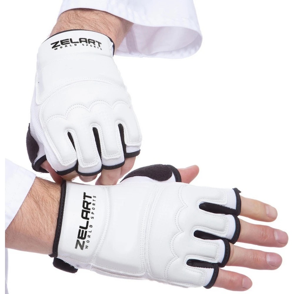 Во время тренировок по тхэквондо важно использовать качественную защиту, которая помогает избежать травм и продлевает спортивное долголетие. Zelart BO-2016-W — это перчатки с удобной конструкцией и надёжной защитой наиболее уязвимых зон рук. Перчатки обеспечивают спортсмену максимальный комфорт. На запястьях они фиксируются небольшой липучкой. Ладонь остаётся открытой, что позволяет активно охлаждать руку. Также у перчаток открытая конструкция пальцев. Изделие изготовлено из полиуретана — синтетического материала, устойчивого к влаге и износу. Амортизация ударов и защита от травм обеспечиваются слоем наполнителя, расположенным на тыльной стороне ладони и на костяшках пальцев. Набивка также присутствует в области запястья.