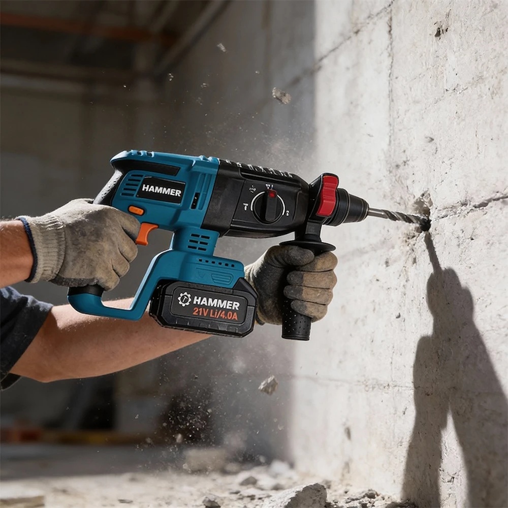 Аккумуляторный перфоратор Hammer предназначен для выполнения сверления, сверления с ударом и долбления при строительных и монтажных работах. Работа от Li-Ion аккумулятора напряжением 21 В обеспечивает мобильность и удобство эксплуатации без подключения к электросети.