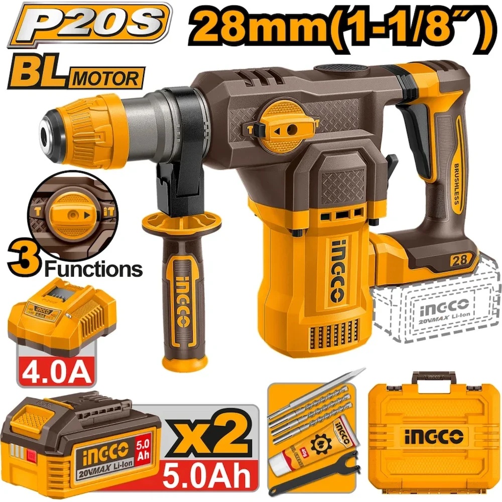 INGCO CRHLI202862 — это мощный аккумуляторный перфоратор промышленной серии (INDUSTRIAL), оснащенный бесщеточным двигателем и обладающий энергией удара 4,5 Дж.