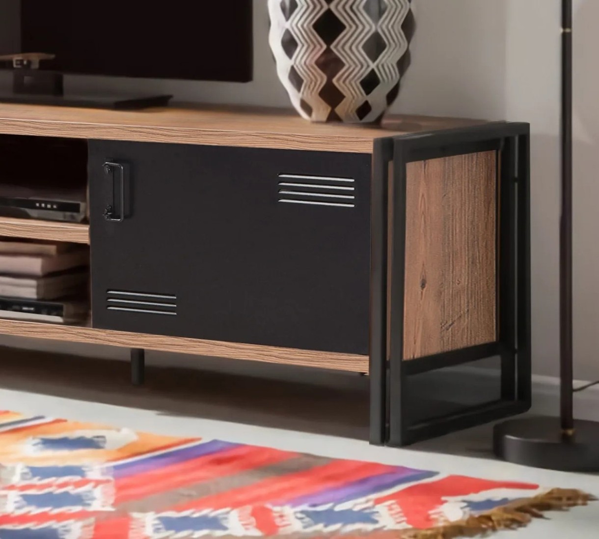 Благодаря металлическим ручкам и дверцам тумба имеет современный стиль с лёгким индустриальным акцентом. Размеры — 180 см ширина, 50 см высота и 45 см глубина — обеспечивают достаточно пространства для телевизора и аксессуаров. Многочисленные полки и высота отсеков 16 см позволяют удобно разместить медиаприставки, игровые консоли, DVD-диски и декоративные элементы.
