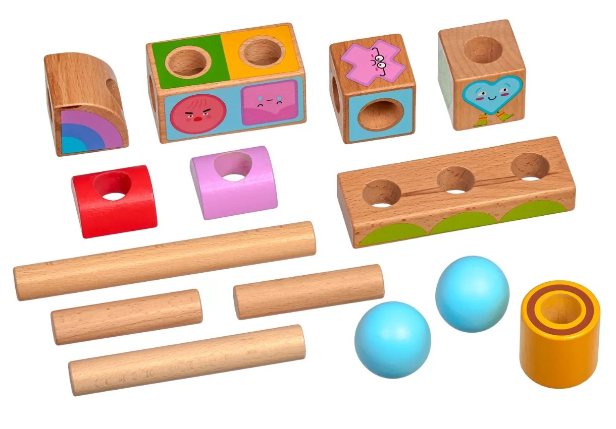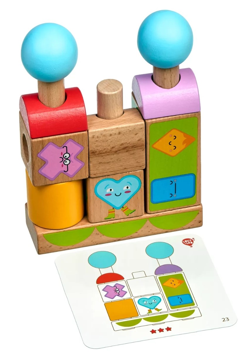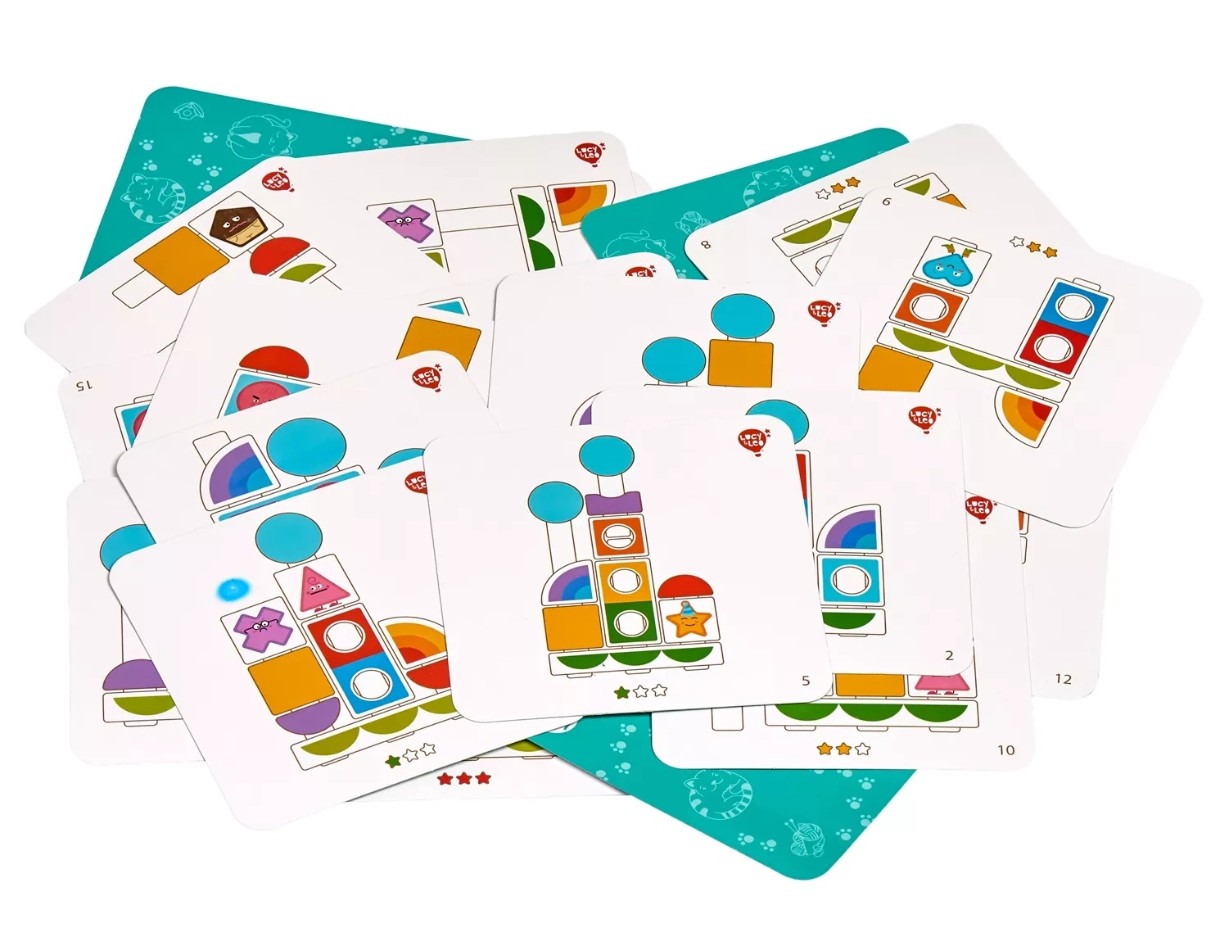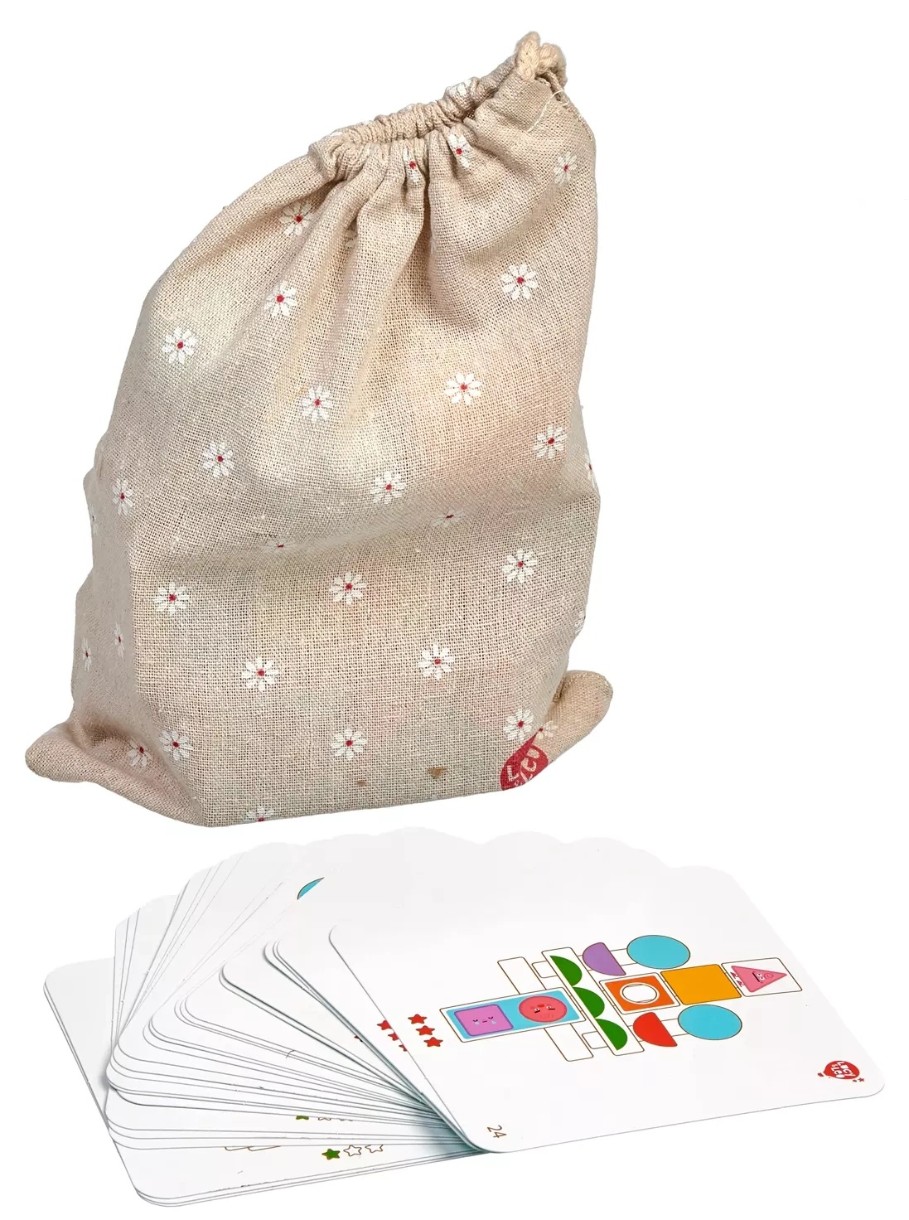 В комплект игрушки входят 4 бруска разных цветов, 10 деталей разной формы, 24 односторонних карточки с заданиями разной сложности и удобный мешочек для хранения.