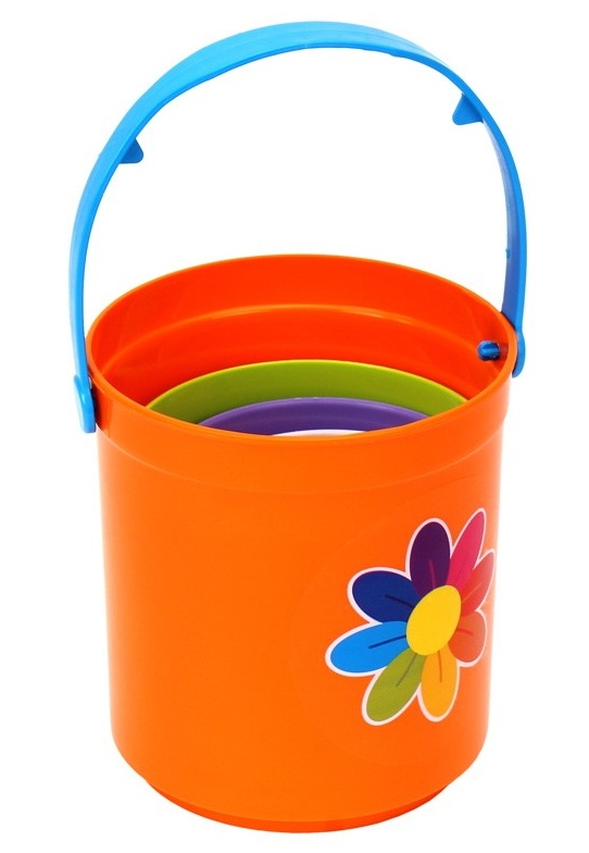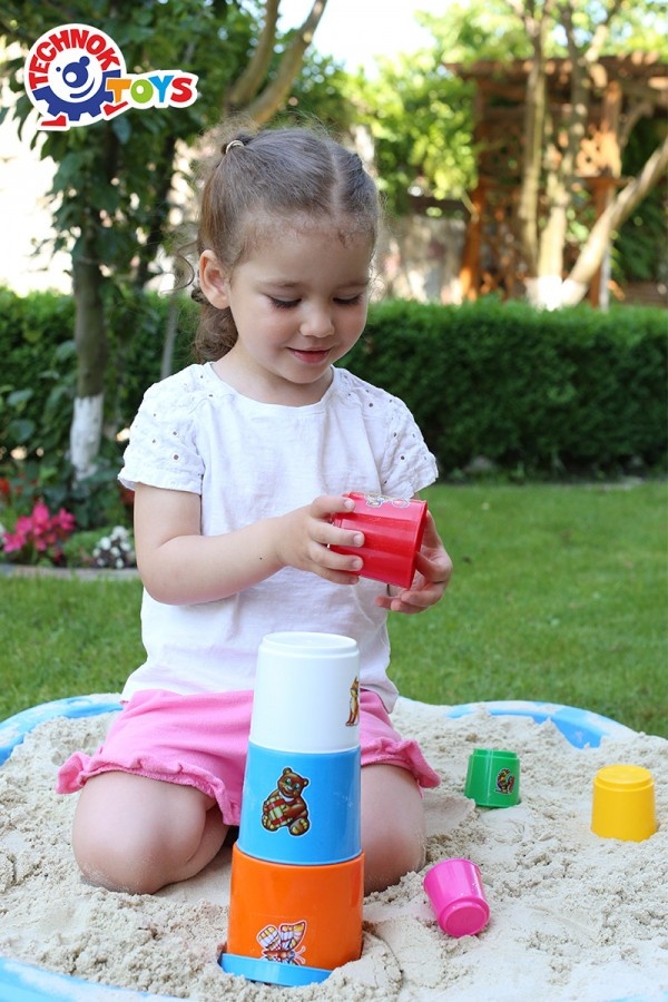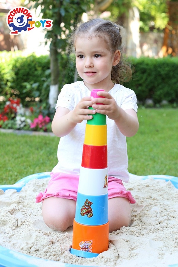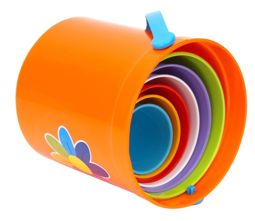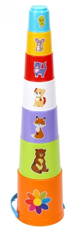 6 разноцветных формочек для песка, которые малыш складывает в пирамидку высотой 35 см или вкладывает друг в друга. На каждой формочке — весёлый зверёк.