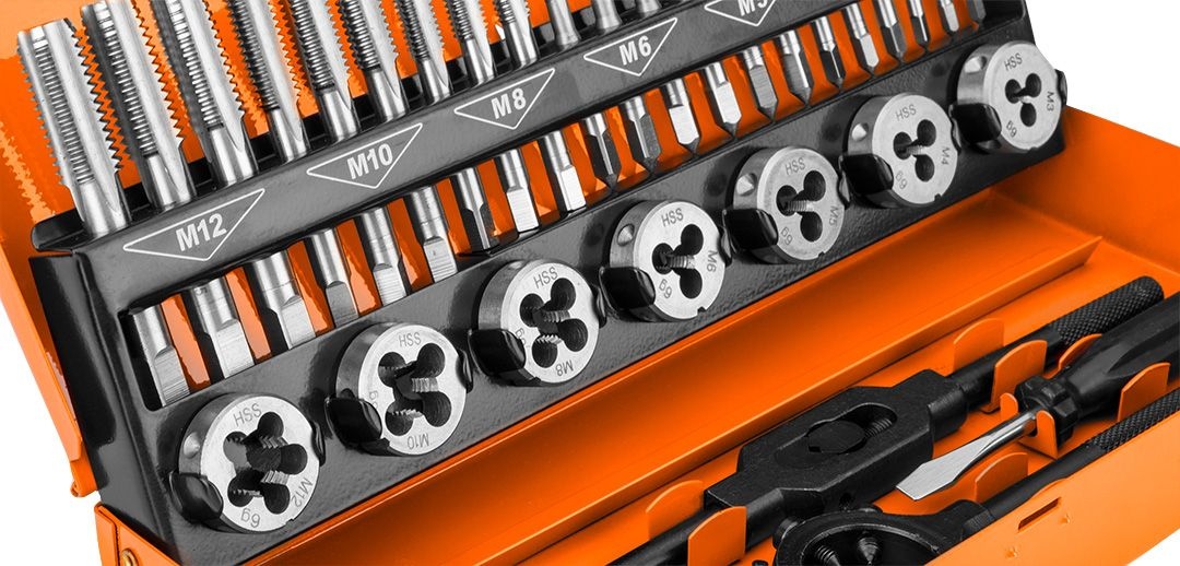 Резьбонарезные плашки и метчики M3-M12, набор из 32 шт. HSS в кейсе 12-915 от NEO - это набор инструментов для нарезания резьбы, включающий ручные метчики и плашки, резьбомер, отвертку для крепления плашек и практичный металлический кейс для хранения элементов. Инструменты (плашки и резьбонарезные плашки) изготовлены из быстрорежущей стали, а калибр и отвертка - из стали 45#. В наборе имеются резьбомеры разных размеров: M3, M4, M5, M6, M8, M10, M12 и зубила размерами - M3, M4, M5, M6, M8, M10, M12. Элементы марки NEO обеспечивают большую точность при изготовлении резьбы. Предназначен для использования в мастерских, а также в механических и слесарных профессиях.