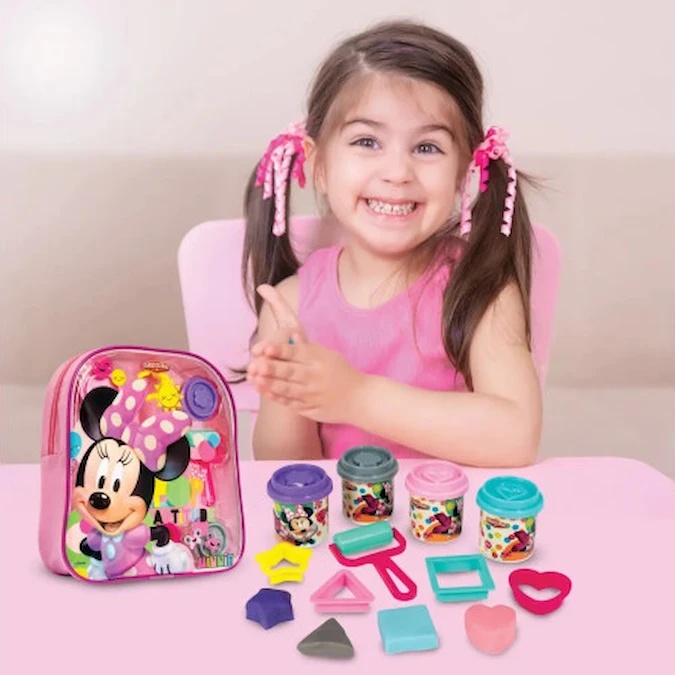 Этот рюкзак Минни не похож ни на одну другую сумку! 4 баночки с тестом разного цвета, 4 крышки-формочки-сюрпризы и еще 5 аксессуаров — все вместе в модном рюкзаке.