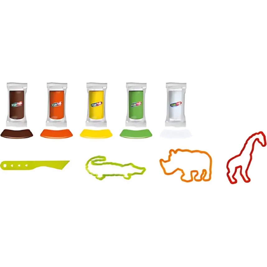 Набор включает 5 цветов пластилина (коричневый, оранжевый, жёлтый, зелёный и белый) по 20 г каждый. В комплект входят 4 формочки в виде животных сафари, таких как жираф, носорог и крокодил, позволяя детям создавать и изучать мир диких животных.