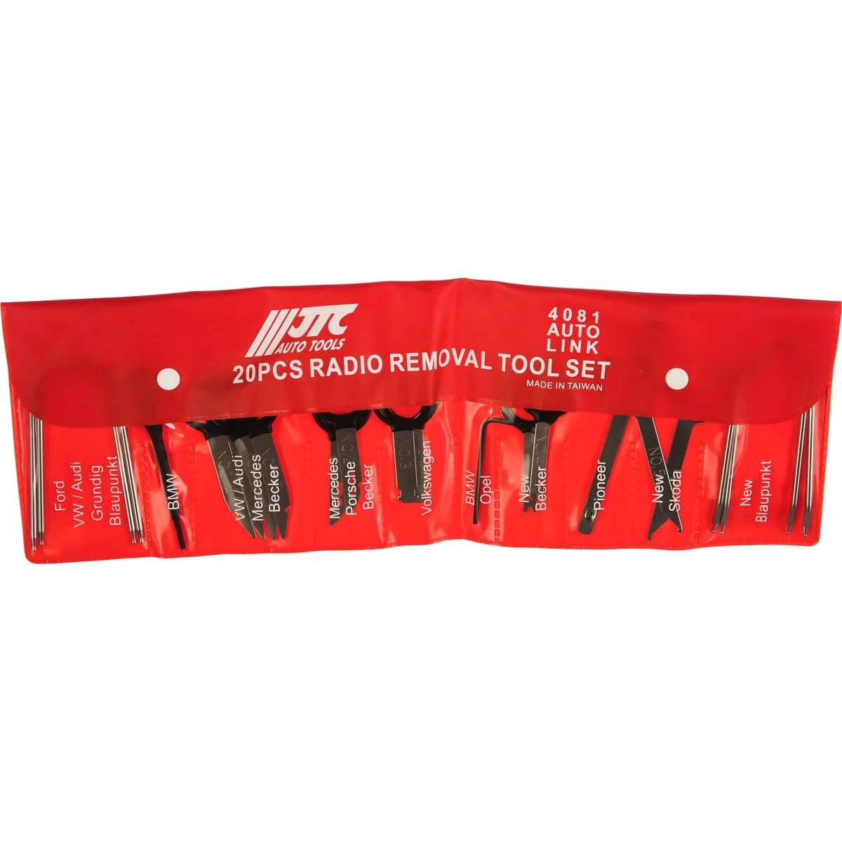 Набор инструментов для демонтажа авторадиоаппаратуры (20 предметов) JTC 4081 позволяет быстро и аккуратно устанавливать в машину магнитолу. Данные инструменты используются для обслуживания автомобилей марок Volkswagen, Audi, Mercedes-Benz, BMW, Ford, Skoda.