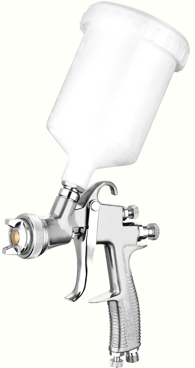 Универсальный окрасочный пистолет системы HVLP с верхним бачком. Применяется для нанесения различных лакокрасочных покрытий, таких как 1К базовые краски, покровные лаки, 2К акриловые краски, грунты-порозаполнители, антикоррозийные грунты и так далее. Может применяться для нанесения красок на водной основе.