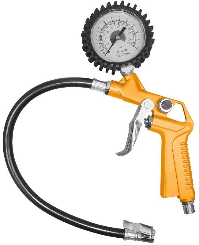 Пистолет для подкачки шин INGCO ATG0601 используется в шиномонтажных или домашних мастерских. С его помощью можно легко и быстро накачать шины и другие резиновые емкости воздухом. Благодаря манометру есть возможность визуально контролировать уровень остаточного давления в шинах. Тип соединения — Рапид (EURO). Максимальное давление — 12 бар.