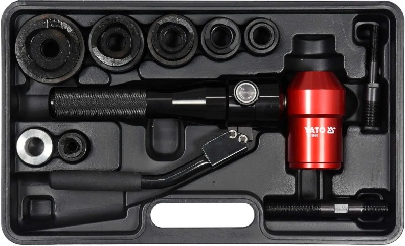 Набор для вырезания круглых отверстий в металлических листах диаметром от 22 до 60 мм. Головка ручного гидроцилиндра может поворачиваться на 360 градусов. Он предназначен для вырезания отверстий при производстве распределительных шкафов для установки ящиков или выключателей. При вырезании отверстий поверхность листа не деформируется и не повреждается. Набор удобен в транспортировке — упакован в прочный чемодан.