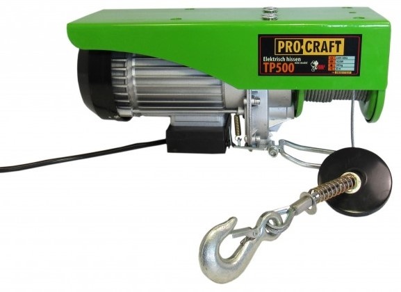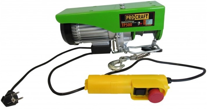 Подъемник электрический Procraft TP500 — предназначен для подъёма и горизонтального перемещения груза весом до 250кг(без блока) и 500кг(с блоком). Электрическая таль состоит из таких частей: электродвигатель, редуктор, тормоз канатного барабана, стальной грузовой трос, крюковая подвеска, пусковая аппаратура. Механизм подъёма приводится в движение при помощи электродвигателя. Двигатель мощностью 1020 Вт вращает редуктор, а затем канатный барабан, плавно поднимая груз на необходимую высоту. На пульте расположены кнопки управления, а именно: красная клавиша служит для блокировки от случайного включения, черная — для запуска и выбора направления подъёма.