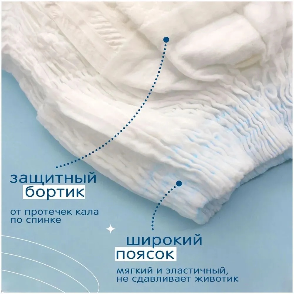Объемная текстура поверхности бережно контактирует с чувствительной кожей малыша, не вызывая излишнего трения и раздражений. Уникальная система впитывания. Широкий абсорбирующий слой подгузника и высокотехнологичный абсорбент обеспечивают мгновенное поглощение влаги. Жидкость распределяется равномерно по всей поверхности. Инновационный абсорбент не комкуется и не разбухает при намокании. Защитные внутренние манжеты с вшитым непромокаемым бортиком вокруг ножек гарантируют надежную защиту от протекания как во время активных игр, так и ночью. Трусики Joonies Marshmallow обладают высокой воздухопроницаемостью и позволяют коже дышать, исключая риск появления опрелостей и парникового эффекта. Мягкий эластичный поясок нежно укутывает животик малыша и надежно фиксирует трусики. Кроме того, подгузники-трусики Joonies Marshmallow невероятно удобны в использовании. Их легко надевать и снимать, что особенно важно в период активности ребенка. Просто вставьте руки в отверстия для ног снизу, проденьте ножки по очереди и малыш готов к новым приключениям. А индикатор намокания подскажет, когда необходимо сменить подгузник. Разорвите использованные трусики по боковым швам и сверните в рулетик. Специальная лента для утилизации на задней части поможет закрепить края свернутого подгузника.