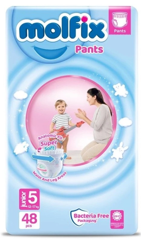 Подгузники Molfix созданы специально для нежной и чувствительной кожи малышей и отвечают самым высоким стандартам качества подгузников категории премиум класса. Они изготовлены с использованием новейших гипоаллергенных и безопасных материалов. Супер впитывающий мягкий слой, защитные боковые барьерчики и эластичная анатомическая форма подгузника по системе Anatomic-Fit не стесняют активных движений ребенка и защищают подгузник от протеканий. Прекрасная система вентиляции по системе Air-soft позволяет коже малыша дышать и не перегреваться. В подгузниках малышу будет удобно отдыхать и ходить, а это подарит Вам спокойствие и радость. Есть индикатор влаги, меняющий цвет. Для снятия необходимо порвать боковые швы. На задней части подгузника есть липучка для компактного сворачивания использованного подгузника.