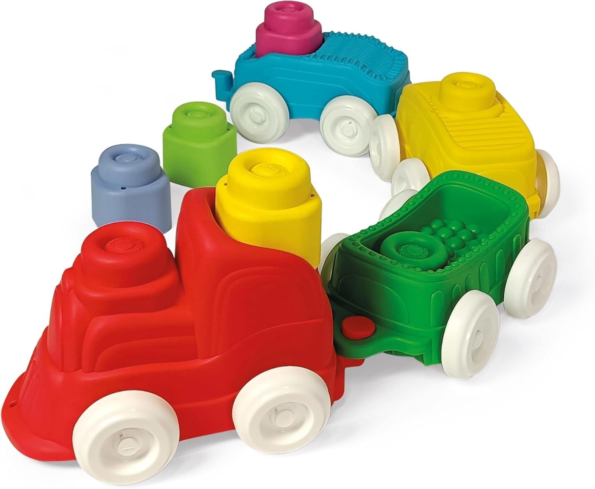 Поезд с локомотивом и его вагонами, с которым дети могут играть и исследовать. Дети смогут открыть для себя рельефные поверхности, различные формы и почувствовать мягкость материала Clemmy, одновременно наслаждаясь сенсорным опытом, который позволит им усовершенствовать свое чувство осязания и навыки ручного труда. Содержит множество разноцветных мягких кирпичей, которые можно вставлять в локомотив и вагоны или складывать друг в друга, чтобы создавать башни, которые можно сносить и восстанавливать снова и снова. Вагоны легко разбираются и собираются. Колеса позволяют поезду двигаться, а детям позволяют придумывать множество историй и плавно путешествовать.