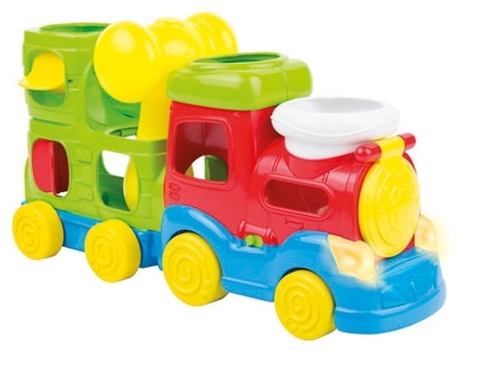 Музыкальный паровозик с шариками и молотком. В поезде есть вагон и 3 цветных шарика. Он имеет кнопку включения/выключения и включает разные песни, сопровождаемые световыми индикаторами. Шары можно хранить внутри вагона. Их можно протолкнуть молотком через специальные места. Также есть нить, за которую можно тянуть.