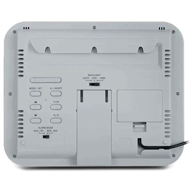 Помимо измерения климатических показателей, модель работает как полноценные настольные часы с функцией будильника. Вы можете запрограммировать напоминания, выбрать 12- или 24-часовой формат времени, а также использовать ночную подсветку дисплея для удобства в темноте.