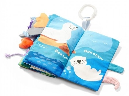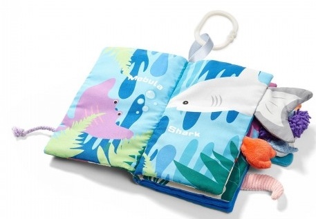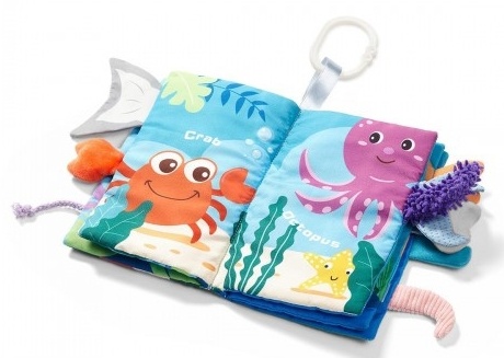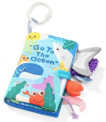 Книжка GO TO THE OCEAN была создана для сенсорного развития ребенка. Она интересно показывает подводный мир. Благодаря хвостикам, торчащим из края книжки, она позволяет изучать различные фактуры материала.