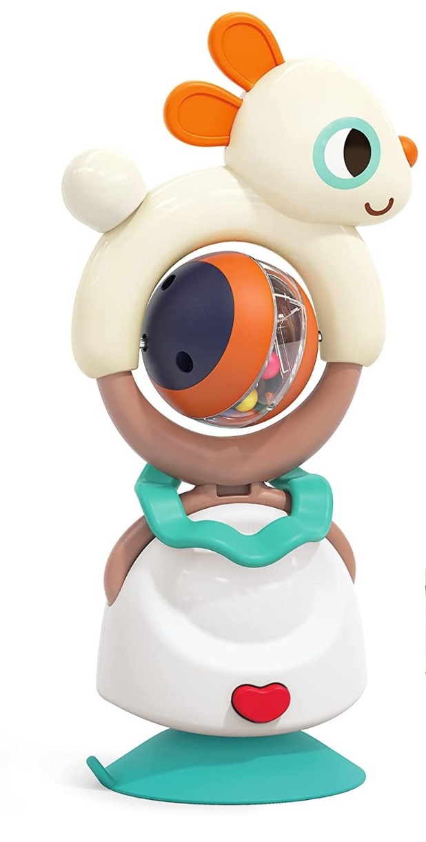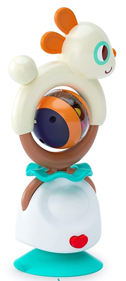 Игрушка-погремушка в виде зайчика, которую можно закрепить на столе ребенка, стульчике, паркете и других ровных поверхностях. Игрушка помогает развивать логическое мышление, ловкость и моторику.