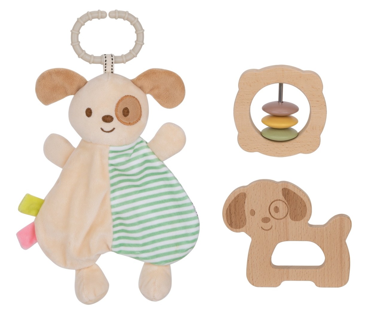 В этот очаровательный набор входит мягкая подвесная мягкая игрушка в виде собаки, которая идеально подходит для объятий и сенсорных исследований. Созданная с особой тщательностью, эта плюшевая собачка дарит вашему малышу успокаивающую мягкость.