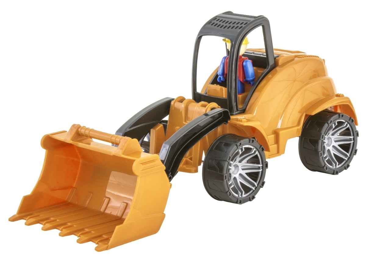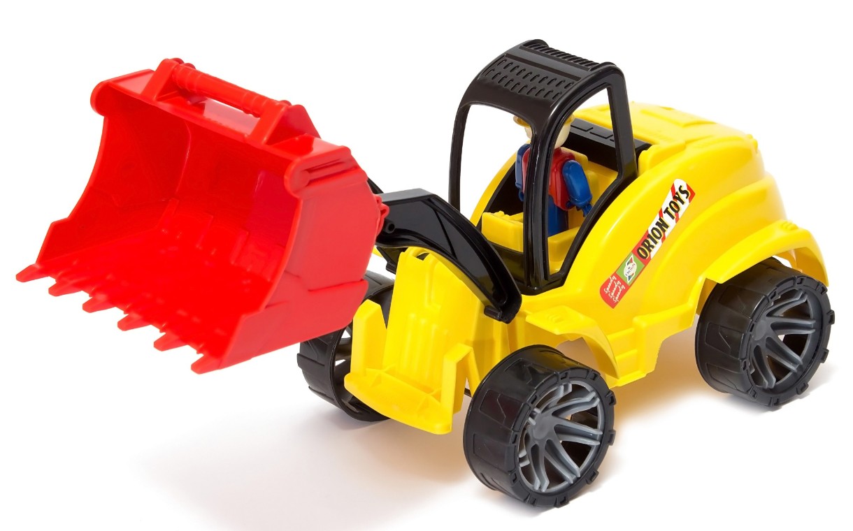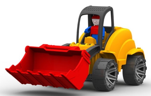 Игрушка транспортная – строительная техника, длина – 400 мм, ширина 155 мм, высота – 185 мм, масса – 0,35 кг, потребительская упаковка – сетка полимерная. Данная модель игрушки изготавливается на основе двухосного корпуса погрузчика, к которому крепится кабина и стрела с ковшом. Стрела и ковш имеют два фиксированных положения поворота вокруг горизонтальной оси. Игрушка имеет 4 колеса с декоративными колпаками. Кабина может откидываться вверх. В кабину устанавливается игрушечный оператор. Все детали изготавливаются методом литья под давлением из полипропилена и имеют яркие цвета.