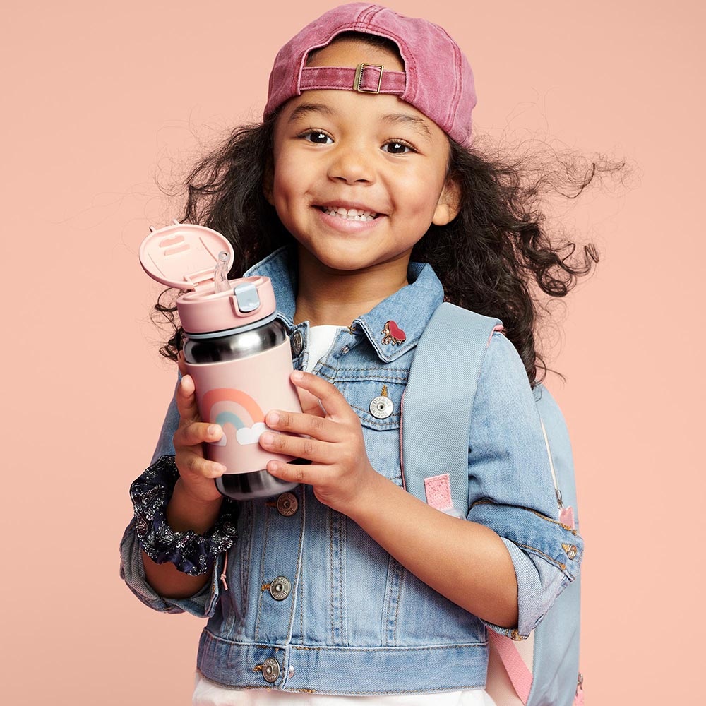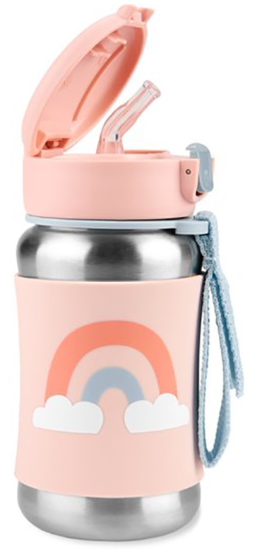 Наша бутылка для воды из нержавеющей стали с классным дизайном, подчеркивающим индивидуальность, помогает сохранять напитки прохладными в дороге. Откидная крышка сохраняет гибкую соломинку в чистоте, а нескользящий силиконовый чехол защищает маленькие ручки от холодных поверхностей. Бери за лямку и вперед!