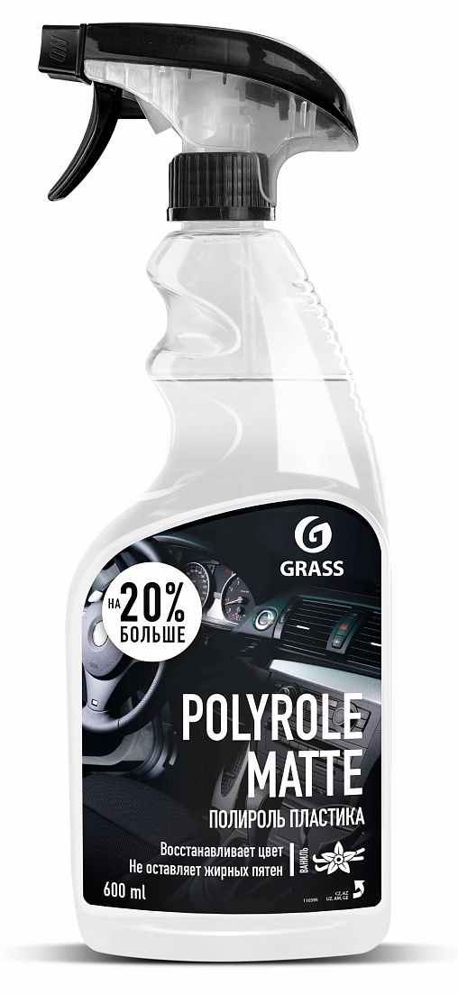 Профессиональный матовый полироль Grass «Polyrole Matte» для обработки приборных панелей, неокрашенных бамперов, покрышек, для очистки и полировки изделий из кожи, дерева винила, пластика и резины, не оставляет жирных пятен, препятствует оседанию пыли придает матовый блеск, обладает приятным ароматом.